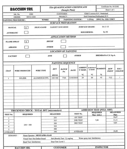 Possiamo eseguire collaudi di rugosità, granulometria degli abrasivi, temperatura ed umidità dell'ambiente, spessore del film umido, spessore del film secco con strumento ottico per ogni strato.